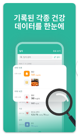 - 생활 기록과 혈당 비교: 식사·운동 기록과 함께 혈당 변화를 확인할 수 있습니다.