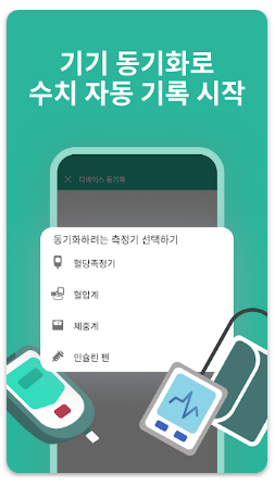 - 측정 기기 연동: 혈당계, 혈압계, 체중계 등 지원 기기와 연동할 수 있습니다.