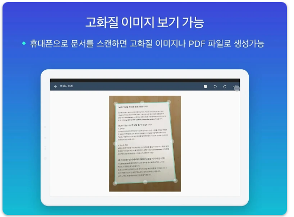 촬영한 문서의 기울어짐과 왜곡을 자동으로 보정하며, 밝기와 대비를 최적화하여 선명한 스캔 결과물을 제공합니다. 이 기능 덕분에 별도의 편집 없이도 깨끗한 문서를 얻을 수 있습니다.