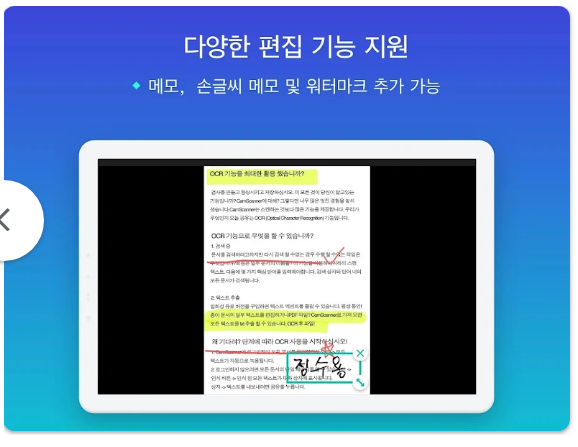 또한 OCR 기능을 통해 이미지에서 텍스트를 추출하고 검색할 수 있으며, 스캔한 문서에 주석, 서명, 워터마크를 추가하는 등 편집 기능을 제공합니다. 클라우드 동기화와 보안 설정을 통해 여러 기기에서 안전하게 문서를 관리하고 공유할 수 있는 점이 큰 장점입니다.