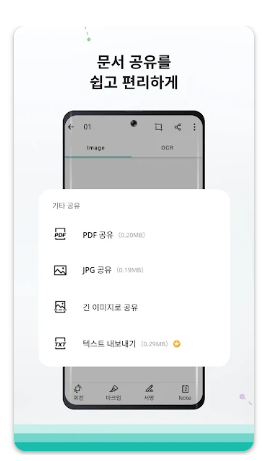 스마트폰 카메라로 종이 문서, 영수증, 명함, 필기 노트 등을 촬영하면 자동으로 문서 테두리를 인식하고 보정합니다. 스캔한 이미지는 PDF, JPG 등 다양한 형식으로 저장할 수 있어 필요에 따라 바로 공유하거나 보관할 수 있습니다.