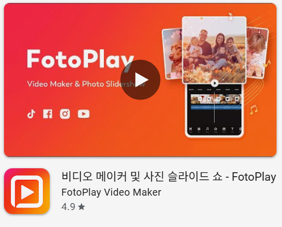 FotoPlay Video Maker는 여러 장의 사진을 음악과 결합해 슬라이드 쇼 형태의 동영상을 만들고 SNS에 공유하는 데 사용할 수 있습니다.