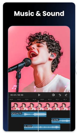배경 음악을 추가하거나 비디오에서 오디오를 추출할 수 있습니다. 앱 내 음악 라이브러리에서 선택하거나, 개인 파일을 업로드할 수 있으며, 필요 시 음성 녹음을 통해 나만의 설명을 삽입할 수 있습니다.