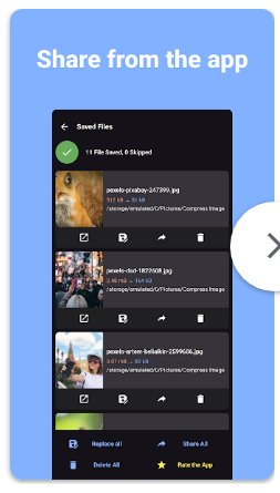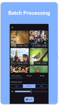선택한 이미지를 빠르게 압축하여 저장 공간을 확보할 수 있습니다. 앱에서 제공하는 자동 압축 기능을 사용하면 MB 단위의 이미지를 KB 단위로 손쉽게 줄일 수 있어, 휴대폰 저장 공간 관리에 유용합니다.