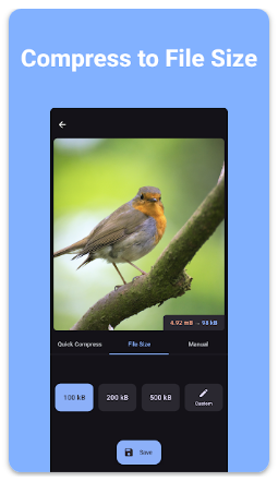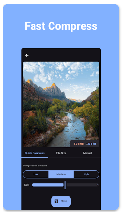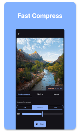 “이미지 압축 - MB에서 KB로” 앱은 휴대폰에 저장된 사진 파일을 간편하게 압축하고 크기를 줄일 수 있는 도구입니다. 앱은 JPEG, PNG, WEBP 등 다양한 이미지 포맷을 지원하며, 압축률과 해상도를 직접 조절할 수 있어 원하는 품질로 사진 용량을 줄일 수 있습니다.
