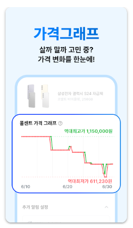 등록한 상품의 상세 페이지에서 가격 변동 그래프를 확인할 수 있습니다. 과거 가격과 현재 가격을 비교하여 구매 적정 시점을 판단하는 데 활용할 수 있습니다.