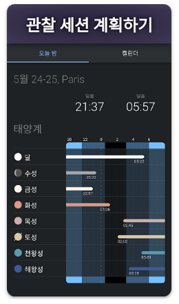 - 위치와 시간을 설정하여 과거 또는 미래의 하늘을 시뮬레이션할 수 있습니다.
