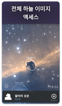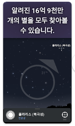 - 스마트폰을 하늘 쪽으로 향하면 현재 보이는 별자리와 천체를 자동으로 식별합니다.