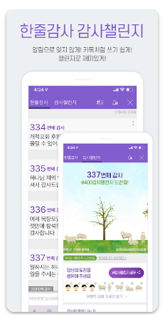 날짜별로 감사 내용을 간단히 기록할 수 있는 한줄 감사 기능이 제공됩니다. 작성된 감사 기록은 누적 관리되어 일상적인 신앙 기록으로 활용할 수 있습니다.