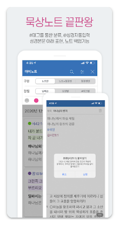 노트는 해당 성경 본문 아래에 저장되며 태그를 통해 관리할 수 있습니다.