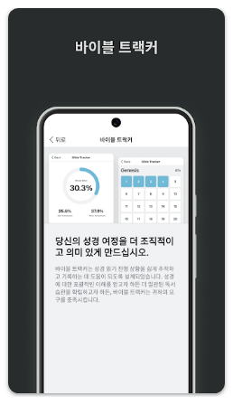 앱에서는 읽기 또는 오디오 청취 진행 상황을 확인할 수 있는 트래킹 기능을 제공합니다. 어느 본문까지 진행했는지 시각적으로 확인할 수 있어 성경 읽기 흐름을 놓치지 않고 이어갈 수 있으며, 장기적인 성경 완독 계획 관리에도 활용할 수 있습니다.