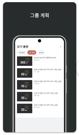 공동체 기능은 그룹을 생성하거나 소그룹에 참여하여 함께 성경 읽기 계획을 진행하는 방식으로 활용합니다.