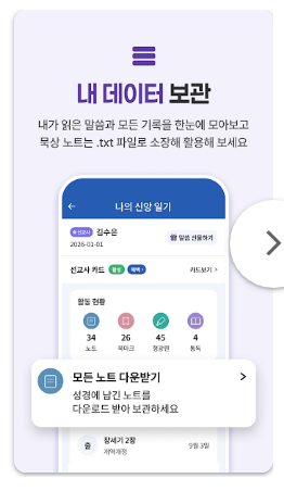 말씀을 읽거나 들으면서 중요한 구절을 저장할 수 있는 북마크 기능과 개인 묵상 기록을 남길 수 있는 기능을 제공합니다. 다시 보고 싶은 말씀을 정리하거나 개인적인 묵상 내용을 관리할 수 있도록 구성되어 있어 지속적인 성경 읽기와 묵상에 활용할 수 있습니다.