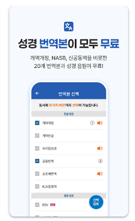 - 출퇴근 시간에 성경을 듣기 위해 설치했습니다. 화면을 계속 보지 않아도 음성으로 말씀을 들을 수 있어서 이동 중에도 자연스럽게 성경을 접할 수 있었습니다. 번역본을 선택할 수 있는 점도 만족스러웠습니다.