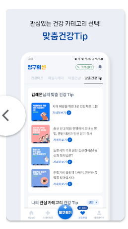 청구의신은 단순한 보험 청구 앱을 넘어 건강관리 기능도 제공합니다. 건강미션과 맞춤형 건강 팁을 통해 사용자의 일상 건강 관리에 도움을 주며, 마음건강 자가진단 기능을 활용해 정신적 상태를 점검할 수 있습니다.
