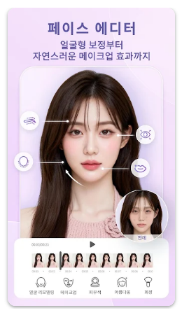 얼굴 윤곽, 눈·코·입의 세부적인 조정, 피부 톤 보정 등 세밀한 편집이 가능하며, 허리와 다리 같은 신체 부위도 자연스럽게 조절할 수 있습니다. 또한 다양한 뷰티 필터와 메이크업 효과를 적용할 수 있어, SNS용 영상이나 셀카 영상 제작에 적합합니다.