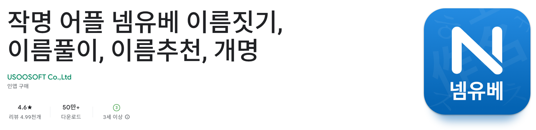 - 설치 방법: “작명 어플 넴유베 이름짓기, 이름풀이, 이름추천, 개명” 앱을 검색 후 설치하시면 됩니다.