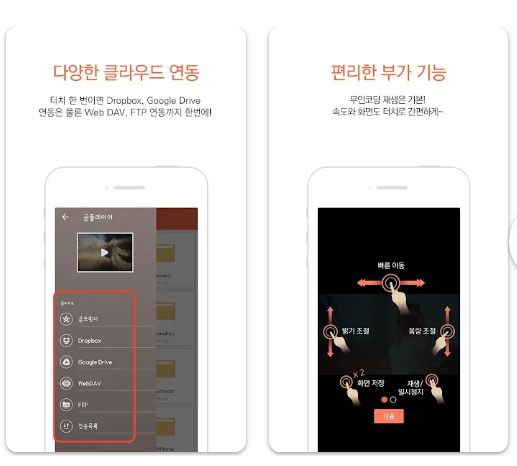 - 클라우드 연동: Dropbox, Google Drive, WebDAV, FTP 등 주요 클라우드 서비스를 연결하여 클라우드에 저장된 영상 파일도 바로 불러와 재생할 수 있습니다. 이를 통해 스마트폰 저장 공간을 절약하면서 언제 어디서나 파일을 확인할 수 있습니다.